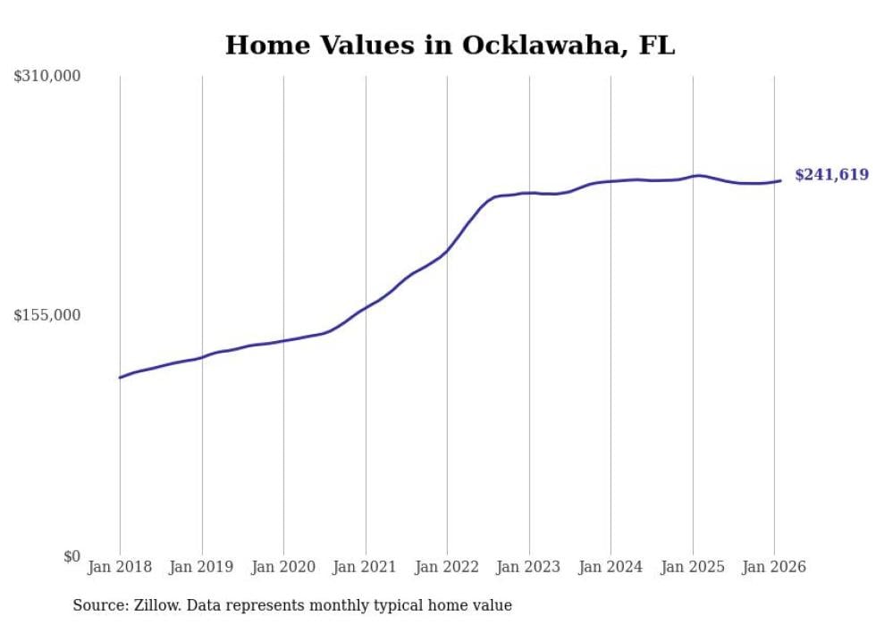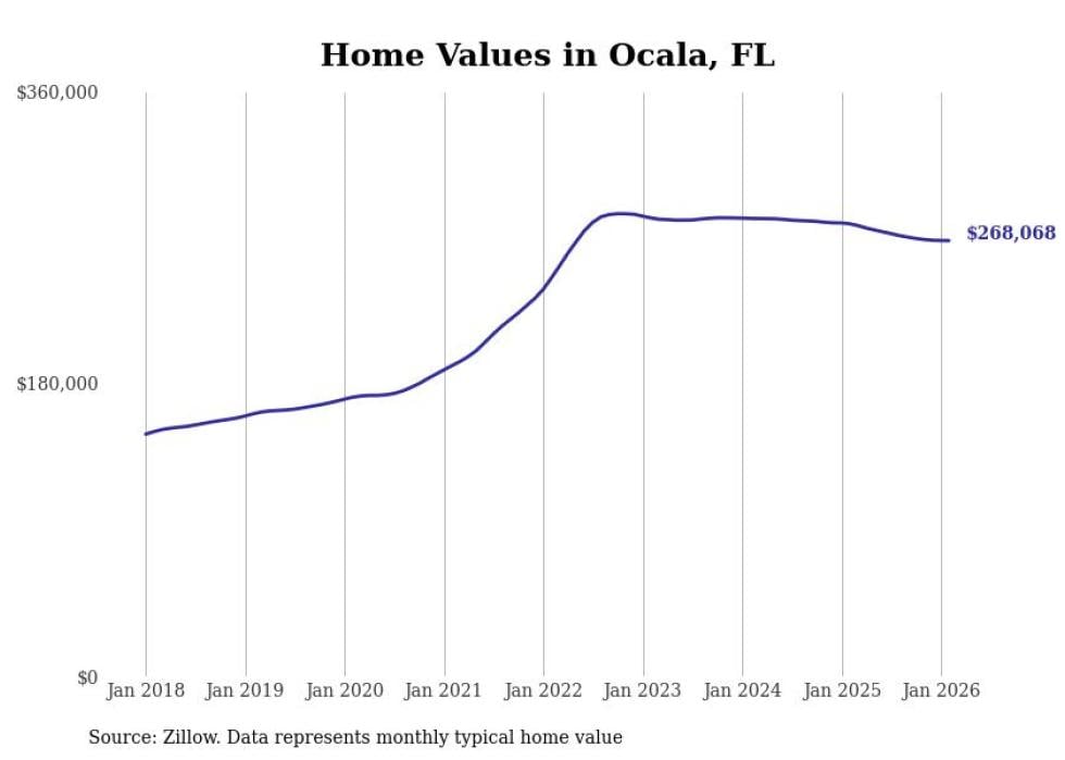 compiled a list of cities with the most expensive homes in the Ocala metro area using data from . Charts show the monthly typical home value since January 2018. All 12 cities and towns with data available were included in the list.