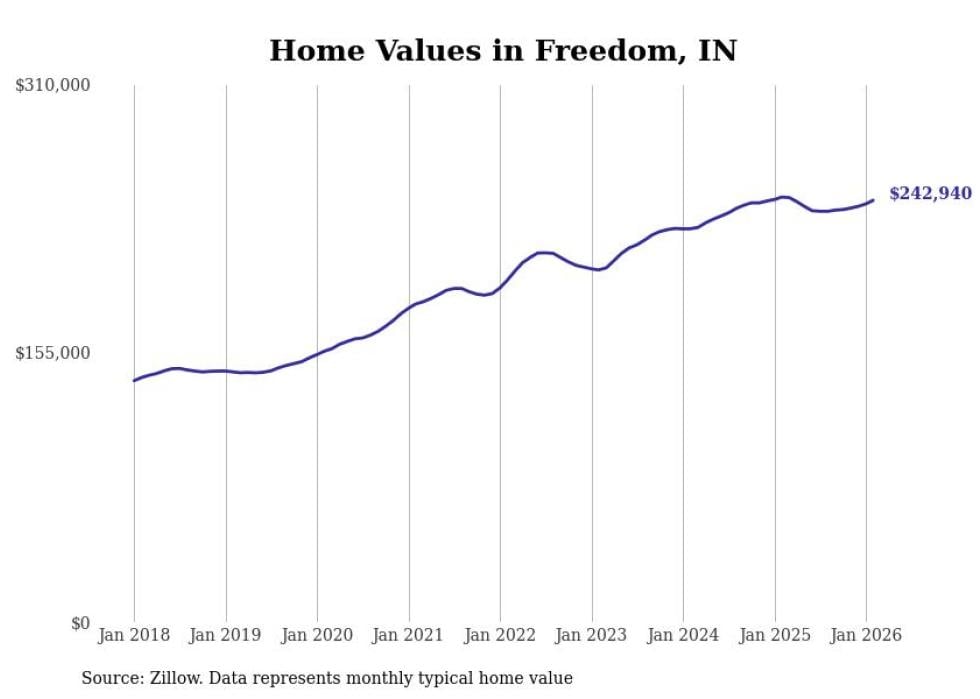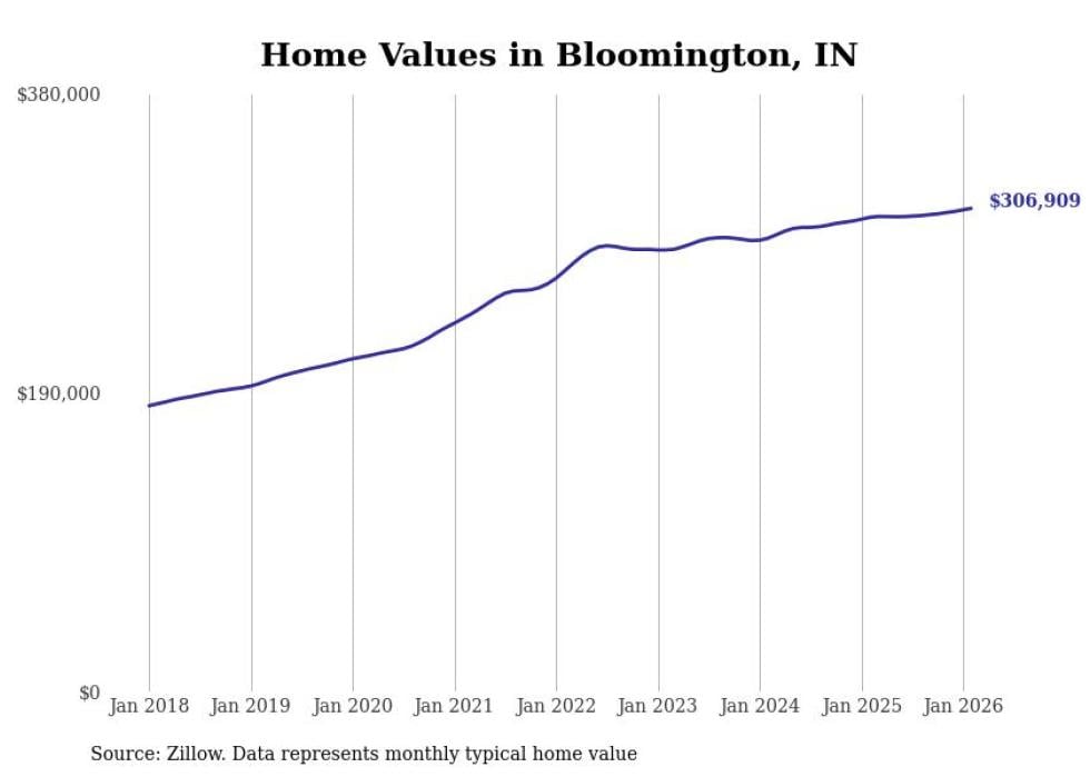 compiled a list of cities with the most expensive homes in the Bloomington, IN metro area using data from . Charts show the monthly typical home value since January 2018.