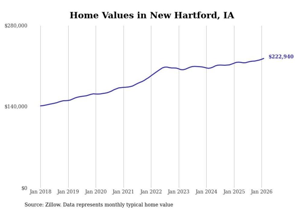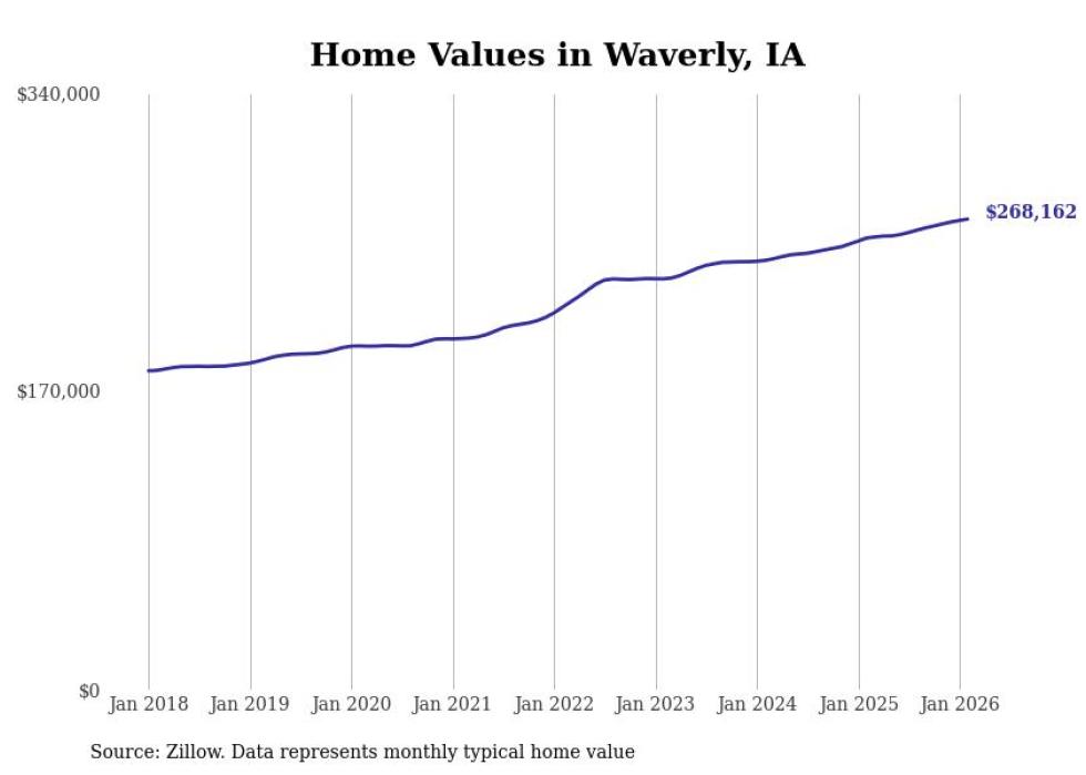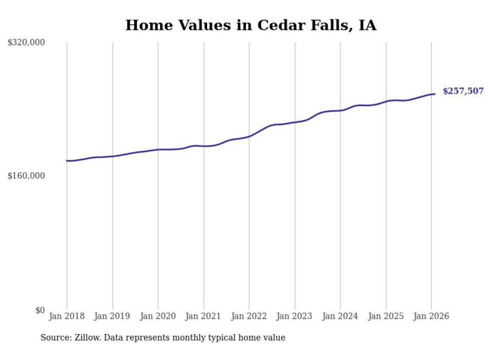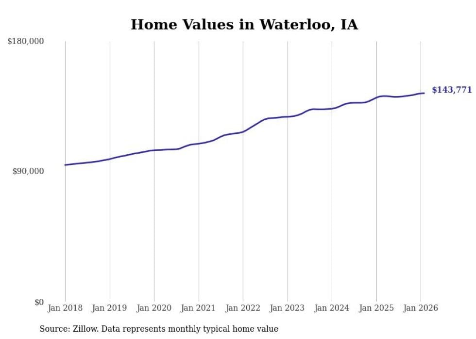 compiled a list of cities with the most expensive homes in the Waterloo-Cedar Falls, IA metro area using data from . Charts show the monthly typical home value since January 2018.