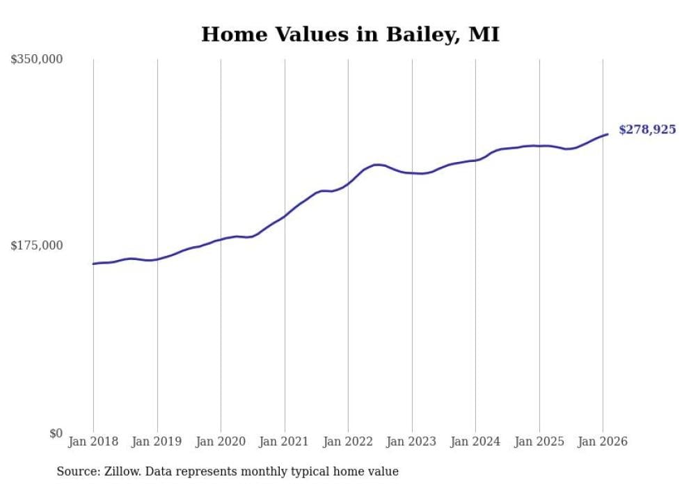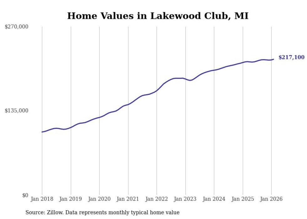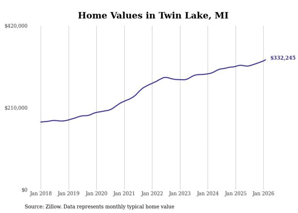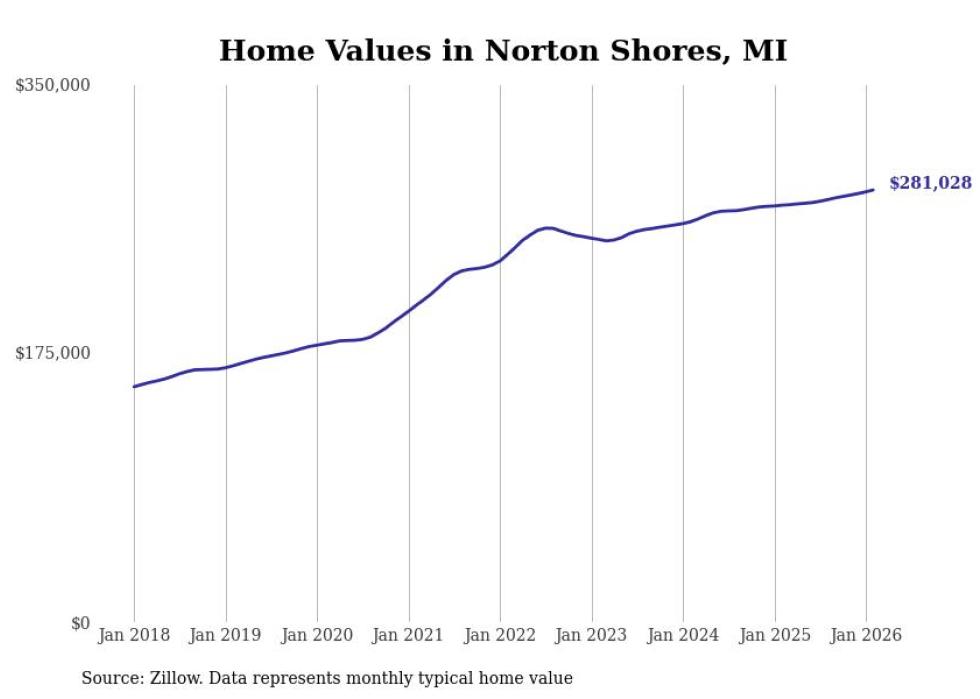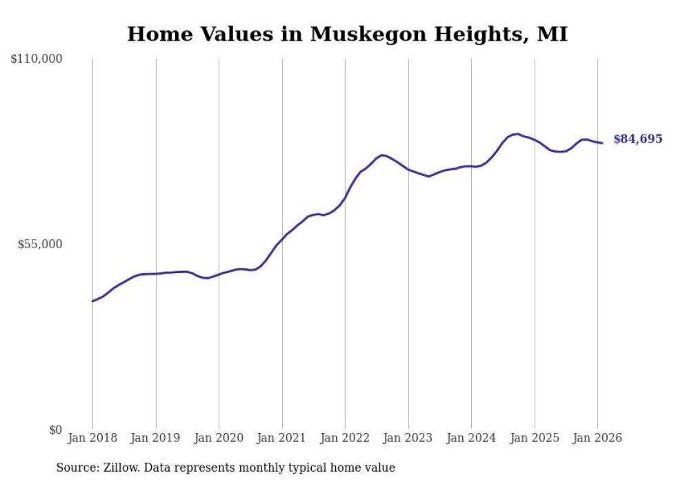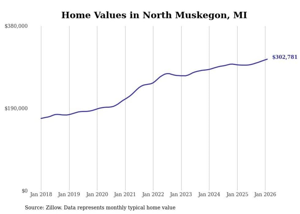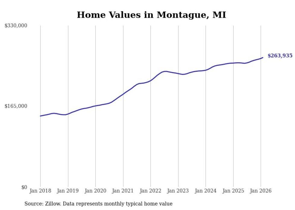 compiled a list of cities with the most expensive homes in the Muskegon, MI metro area using data from . Charts show the monthly typical home value since January 2018.