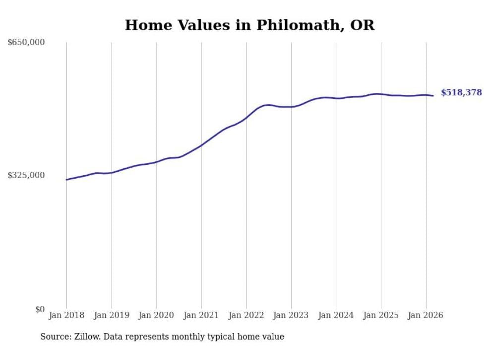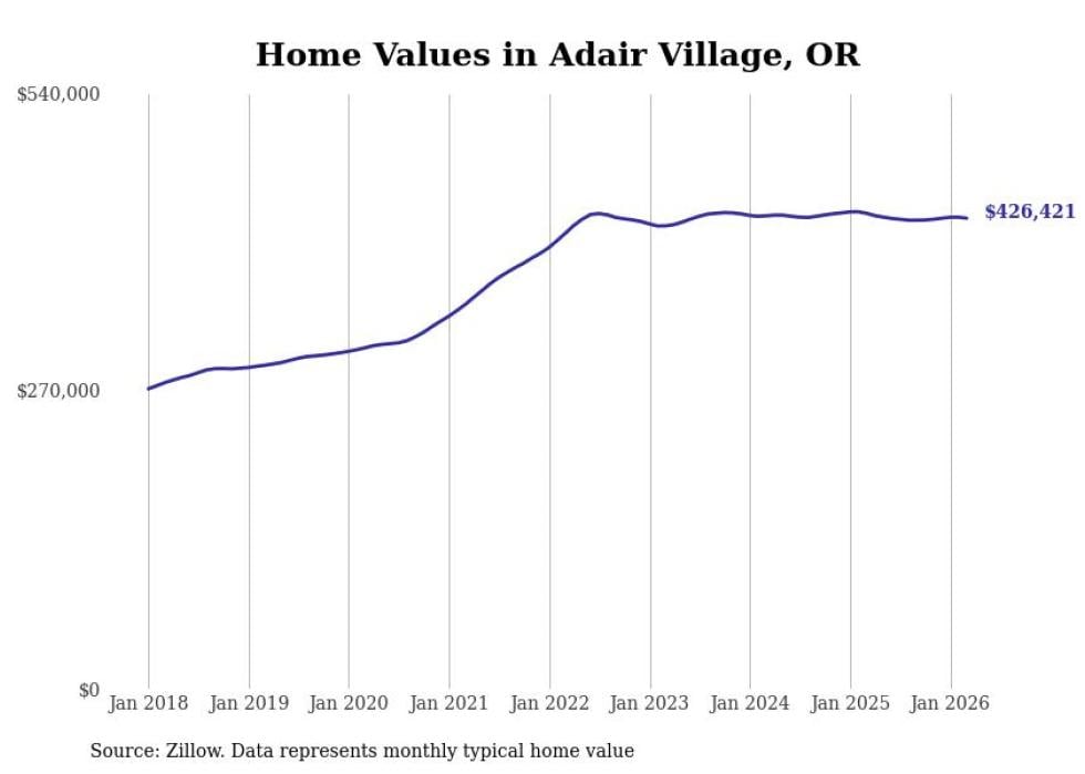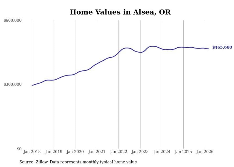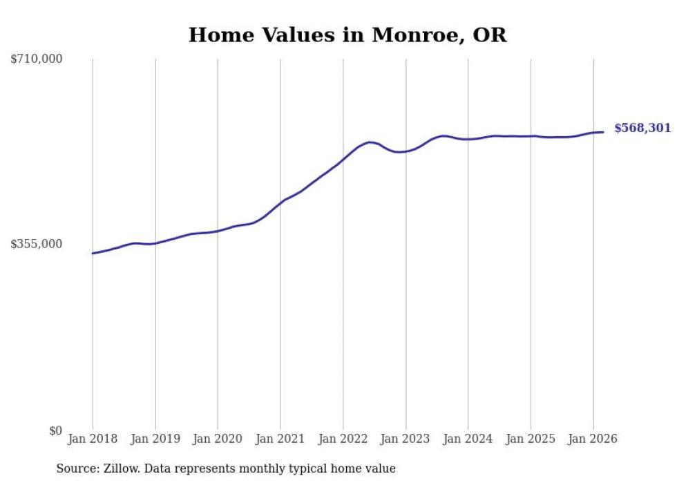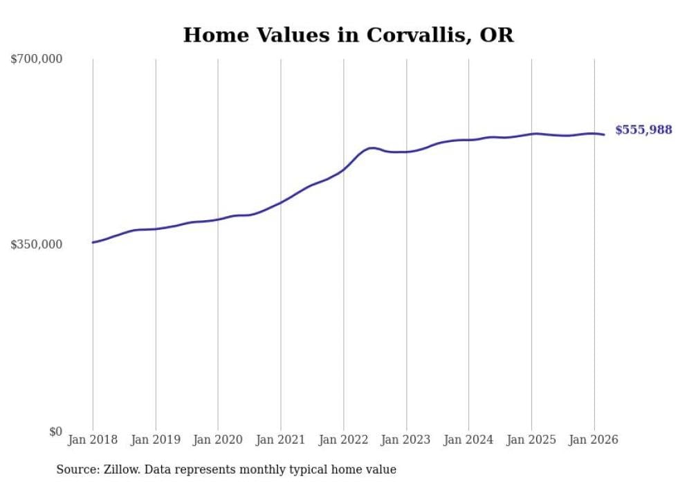 compiled a list of cities with the most expensive homes in the Corvallis metro area using data from . Charts show the monthly typical home value since January 2018. All 5 cities and towns with data available were included in the list.